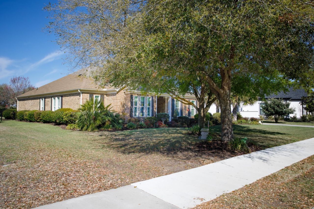 Absolutely gorgeous three bedroom, 2 and 1/2 bath all brick home on almost a half-acre lot. Natural gas home on quiet, dead-end street. Recessed lighting, Custom window treatments, crown molding throughout, wains coating in dining room, tray ceiling in master bedroom, master with two walk-in closets, walk in shower, dual sinks and makeup area. Jack & Jill bath with dual sinks serves two large bedrooms. Eat-in kitchen with large island and huge walk-in pantry. Gas range. Carolina room with built in bookcase, large living room with T.V. hookup over gas fireplace. Laundry room off Master bedroom. Screened porch with custom shades and tiled floor. Large, paved patio with gas hookup for grill. Beautifully landscaped yard with frontage on a pond. New bulkhead installed in 2025, fenced yard, natural gas heat and on demand Renai water heater. Hurricane accordion shutters on all windows and door pull-down stairs in garage for attic access. LVF in living areas, carpet in bedrooms, tile in baths and laundry room. Whole house surge suppressor has been installed. Trex built-in pest control system. Amenities include two swimming pools, waterslide, splash pad, hut tub, pickle ball court, basketball court, playground, and gym. There is nothing left to want for here. See today!!