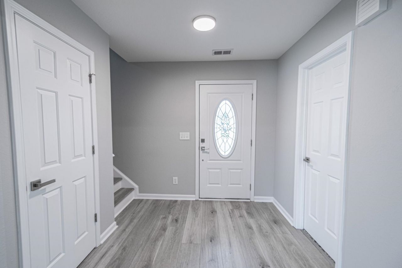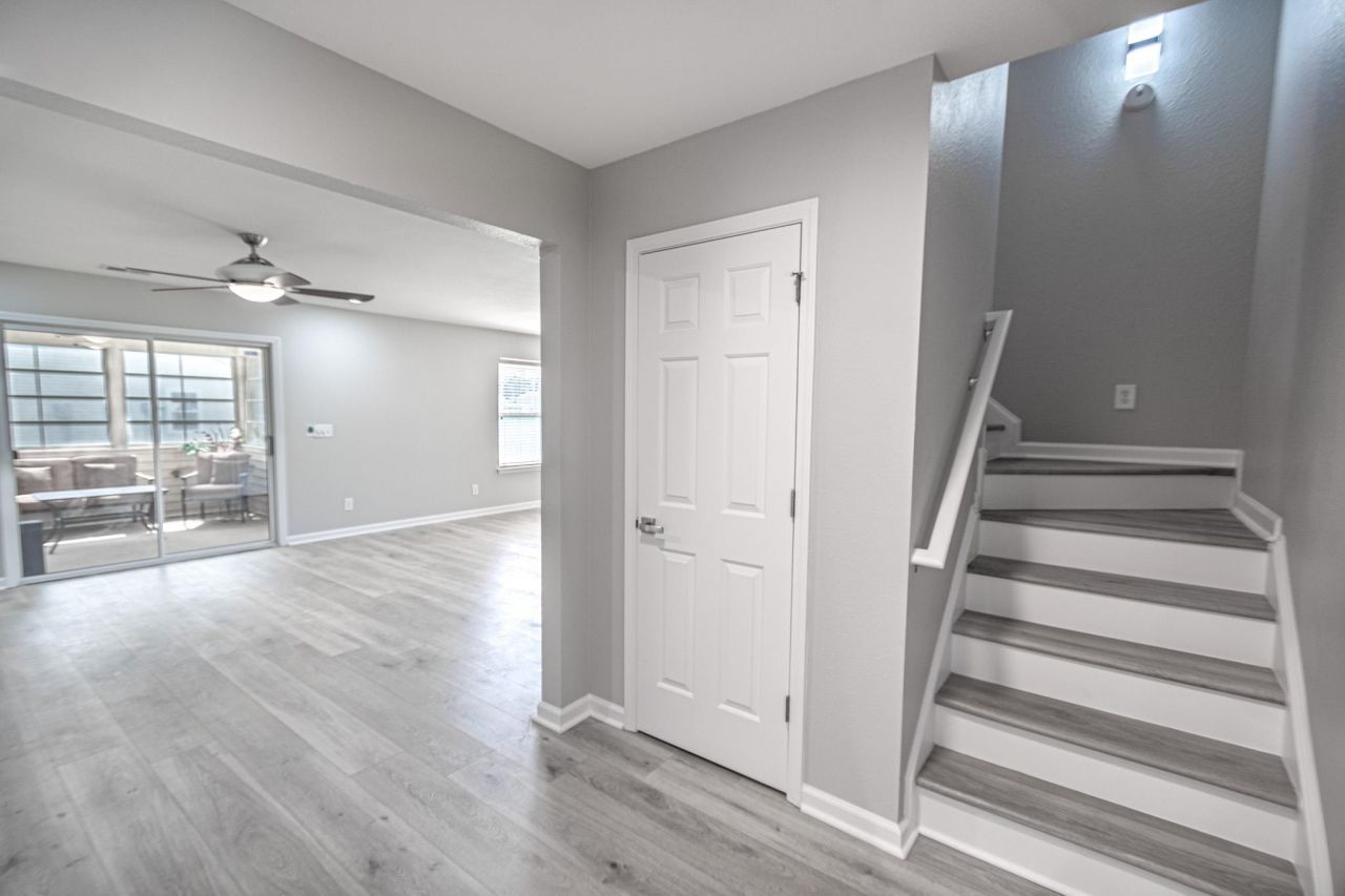 Welcome to this beautifully maintained two-story home situated on a desirable corner lot with peaceful pond views in the sought-after Cameron Village community. Offering 3 bedrooms and 2.5 baths, this home features stylish LVP flooring throughout and a functional, open-concept layout perfect for everyday living and entertaining. Step inside through the foyer into a spacious living and dining room combo, complete with a ceiling fan and sliding glass doors that lead to a screened-in four seasons porch, ideal for enjoying the outdoors year-round. The custom half bath on the main level showcases a unique vanity, eye-catching backsplash, and Spanish-style tile flooring. The kitchen is a standout with white cabinetry, Fantasy Brown granite countertops, a herringbone tile backsplash, and white appliances, offering both style and functionality. A convenient laundry room with washer and dryer is also located on the first floor. Upstairs, the primary suite features a ceiling fan, walk-in closet, and a cozy sitting area. The private En Suite bath includes a custom vanity, decorative backsplash, Spanish-style tile flooring, and a beautifully tiled shower with a glass door. Two additional bedrooms, each with ceiling fans, share a hall bathroom with a vanity and tub/shower combination. Enjoy the spacious backyard and the added privacy of a corner lot with pond views. Cameron Village offers an array of amenities including a resort-style pool, clubhouse, tennis courts, basketball courts, scenic lakes, sidewalks, and more, providing a true coastal lifestyle experience. Located close to shopping, dining, entertainment, and a short ride to the beach. Square footage is approximate and not guaranteed. Buyer is responsible for verification.
