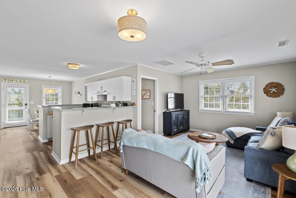 Welcome to 1331 Carolina Blvd, an inviting 3-bedroom, 2-bathroom retreat in the heart of Topsail Beach's coveted south end. Affectionately known as the ''Sassy Sea Turtle,'' this home perfectly captures the island's signature ''step back in time'' charm.Walk into a stunning entryway that flows into an expansive open floor plan, designed for both easy entertaining and coastal relaxation. The main living area features sliding glass doors that open to a private balcony with magical water views. The layout is ideal for hosting; while the Primary Suite is thoughtfully positioned for privacy, the two guest bedrooms are joined by a convenient jack and jill bathroom, making it a functional space for visitors.The lifestyle here is truly one-of-a-kind. After a day of sun at pristine south-end beaches, rinse off in the outdoor shower. This neighborhood fosters a relaxed lifestyle, perfect for enjoying a bike ride or roller skating trip to grab local ice cream.Only a few houses down from sound access for kayaking and paddleboarding, and just a short distance from the natural beauty of Serenity Point. Whether you are looking for a turnkey investment or a personal coastal escape, The Sassy Sea Turtle is ready for its next chapter.