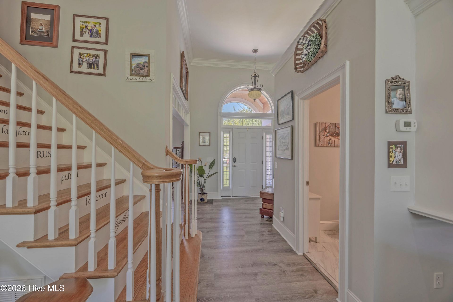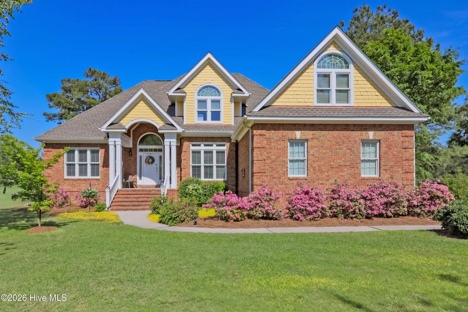 Welcome to 136 Pilot House Drive, an extraordinary custom-built brick home located in the highly sought-after gated golf community of River Landing. Nestled among mature pine trees and overlooking a lush fairway, this property offers a perfect balance of luxury, comfort, and natural beauty.Situated on a spacious half-acre fenced lot, this four-bedroom home provides both privacy and room to enjoy outdoor living. Thoughtfully landscaped grounds and a welcoming covered front porch set the tone for the charm found throughout the home.Inside, a formal dining room with tray ceilings and plantation shutters flows seamlessly into the kitchen, creating an ideal layout for both everyday living and entertaining. The great room is filled with natural light from a stunning wall of windows and features cathedral ceilings, a gas fireplace with a custom mantel, and built-in shelving.The kitchen is a true centerpiece, complete with classic white cabinetry, granite countertops, stainless steel appliances, a stylish backsplash, and a large island with bar seating. A built-in bar and wine refrigerator add an extra touch of sophistication.The primary suite offers a private retreat with dual closets and a spa-inspired ensuite featuring double vanities and a tiled shower.Upstairs, you'll find two additional bedrooms, a spacious shared bath, and a versatile bonus room over the garage -- perfect for a home office, media room, or hobby space.Step outside to a raised patio designed for easy enjoyment, featuring low-maintenance railings, a retractable awning, and a built-in gas grill -- ideal for entertaining or relaxing while taking in the serene golf course surroundings. The fully fenced backyard provides ample space for pets, play, and gatherings.Additional highlights include a newly encapsulated crawlspace with conditioned air (July 2024), new roof (July 2024), generous storage options, attic space, and garage shelving.This exceptional home combines timeless design, modern updates, and a premier golf course setting--offering a lifestyle you won't want to miss.River Landing offers optional and affordable memberships with two NC Golf Panel designated ''Top 50'' championship golf courses and world-class club amenities while still maintaining the charm and ease of a small town. Enjoy the outdoor pool, fitness club, and tennis and pickleball courts. Savor fine dining at the at the grand clubhouse or a casual meal at the grille/bar. Participate in one of the many social clubs and classes. Get your exercise on the beautiful walking/biking trails or take in the natural surroundings at the River Lodge with kayak access to the beautiful Northeast Cape Fear River. A day at the beach is an easy 45 minute drive. A must see before deciding to where to live in the Southeast.