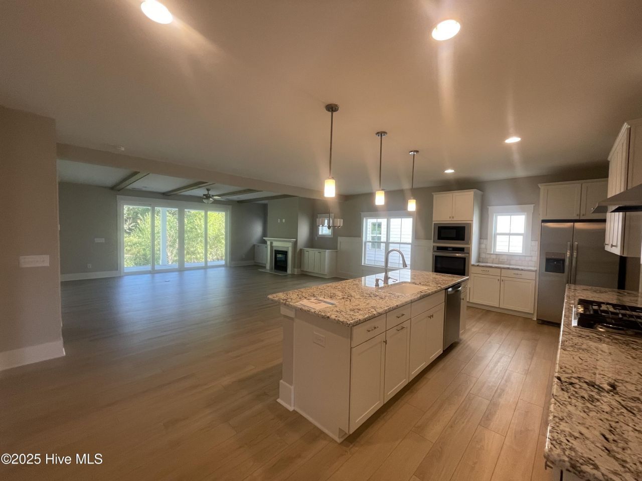 The Sanctuary at Sunset Beach inspires one to live the coastal life and The Scout Home Plan in the Coastal Elevation is sure to delight. The Scout is 2,033 sq. ft. on one level with 3 bedrooms and 2.5 baths. Structural options and upgrades include an 8' center meet slider from great room to covered porch, prestige kitchen with gas cooktop, optional owners bath with large tile shower and frameless shower door, 8'' vanity faucets in all baths, base cabinets on each side of fireplace with windows above, white wood shelving in owners closet and pantry, stained exposed beams in great room, craftsman trim package throughoutKitchen structural and upgrade details: prestige kitchen with gas cooktop, cast iron undermount sink, 42'' upper cabinets, full depth cabinet with end panel over refrigerator, trash can pull out.