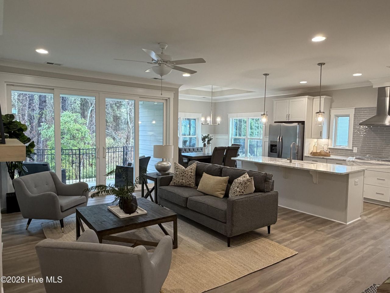 The Ivy home plan in the charming Cottage Elevation graces the beautiful community of The Sanctuary at Sunset Beach. The Ivy is 1615 sq. ft. of living space on one level. This 3 bedroom/2 bath home is an open concept plan that lives large. Structural options and upgrades include prestige kitchen, 8' tall center meet sliding door from great room to covered porch, double closets in owners suite, large tile shower in owners bath, base cabinets with upper shelving on each side of fireplace, craftsman trim package throughout, crown molding in main living areas and owners bedroom, floor to ceiling shiplap on fireplace with stained floating mantle and tile fireplace surround, white wood shelving in owners closet and pantry.