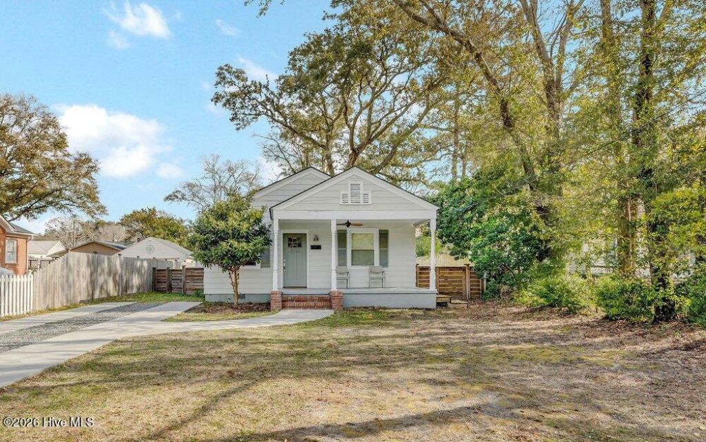 Located in Wilmington's Historic Sunset Park, this beautifully reimagined 1947 bungalow pairs preserved mid-century character with modern functionality. Inside, the open-concept living space creates an inviting flow where natural light floods through custom window treatments to complement the timeless hardwood flooring. Enjoy the contemporary convenience and aesthetic of stainless-steel kitchen appliances, including a JennAir gas range, granite countertops, and ample soft-close cabinetry. The upgraded tankless gas water heater and bath enhance everyday comfort. Expanded to create a spacious primary bedroom, the layout retains flexibility with potential for future reconfiguration to the previous 3-bedroom floor plan. Live oaks, a mature loquat tree, and established landscaping frame the home's outdoor spaces, while the covered front porch offers a welcoming place to enjoy the neighborhood. The fenced backyard, complete with a custom-built shed, extends the home's living space for everyday enjoyment, gardening, entertaining, and outdoor living. The side driveway combines added curb appeal with convenient off-street parking. Ideally located minutes from Wilmington's Downtown Riverwalk, South Front District, Greenfield Lake Amphitheater, and coastal amenities.