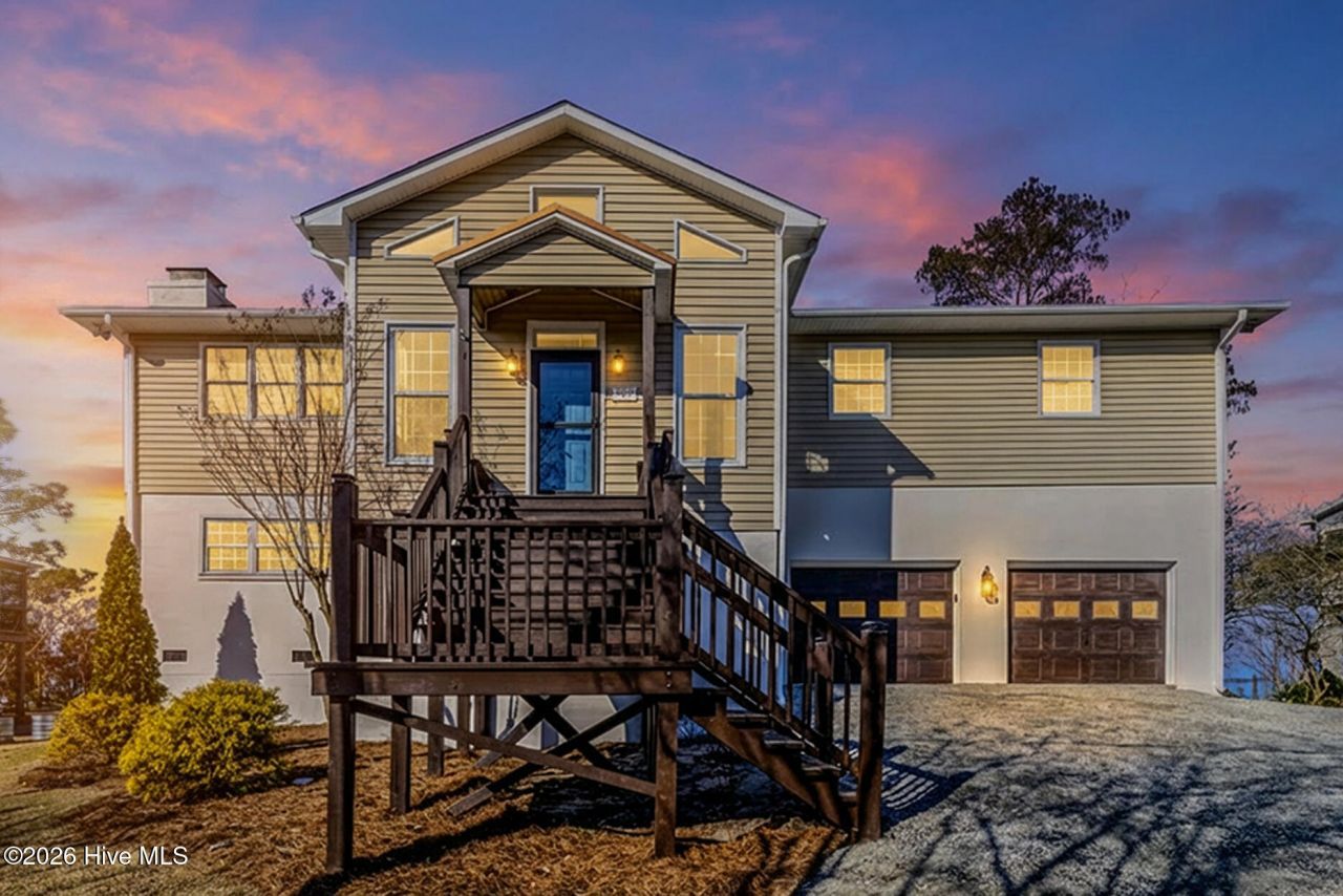Where the river meets the sky in a wash of gold and crimson, this extraordinary Neuse River waterfront home delivers luxury living with front-row sunset views and the iconic skyline of historic downtown New Bern as your backdrop. With a private dock and sandy beach along the water's edge, every day here feels like a retreat. Thoughtfully designed to highlight the views, the main living level offers an open-concept layout with a spacious living room anchored by a wood-burning fireplace, a light-filled dining area, and a beautifully updated kitchen featuring Bosch stainless steel appliances, quartz countertops, a generous island with beverage refrigerator, and walk-in pantry. The re-screened porch and freshly painted decks create seamless indoor-outdoor living--ideal for entertaining or unwinding as the sun dips below the horizon. The owner's suite impresses with vaulted ceilings, dual closets, and an updated en suite with dual sinks, walk-in shower, laundry access, and direct porch entry to a hot tub overlooking the river. The hall bathroom has been completely renovated, and the bath off bedroom four has been refreshed. Additional guest rooms and flexible spaces offer comfort and versatility, while the lower-level suite with fireplace, full bath, kitchenette, private deck, and separate entrance provides an ideal space for extended stays. Many windows have been replaced and the home has been freshly painted, enhancing both style and peace of mind. Outside, enjoy boating, fishing, and quiet mornings on your private beach as dolphins, bald eagles, and even otters make the occasional appearance. Each evening ends with a spectacular sunset over the water--an unforgettable waterfront lifestyle defined by beauty, luxury, and thoughtful updates.