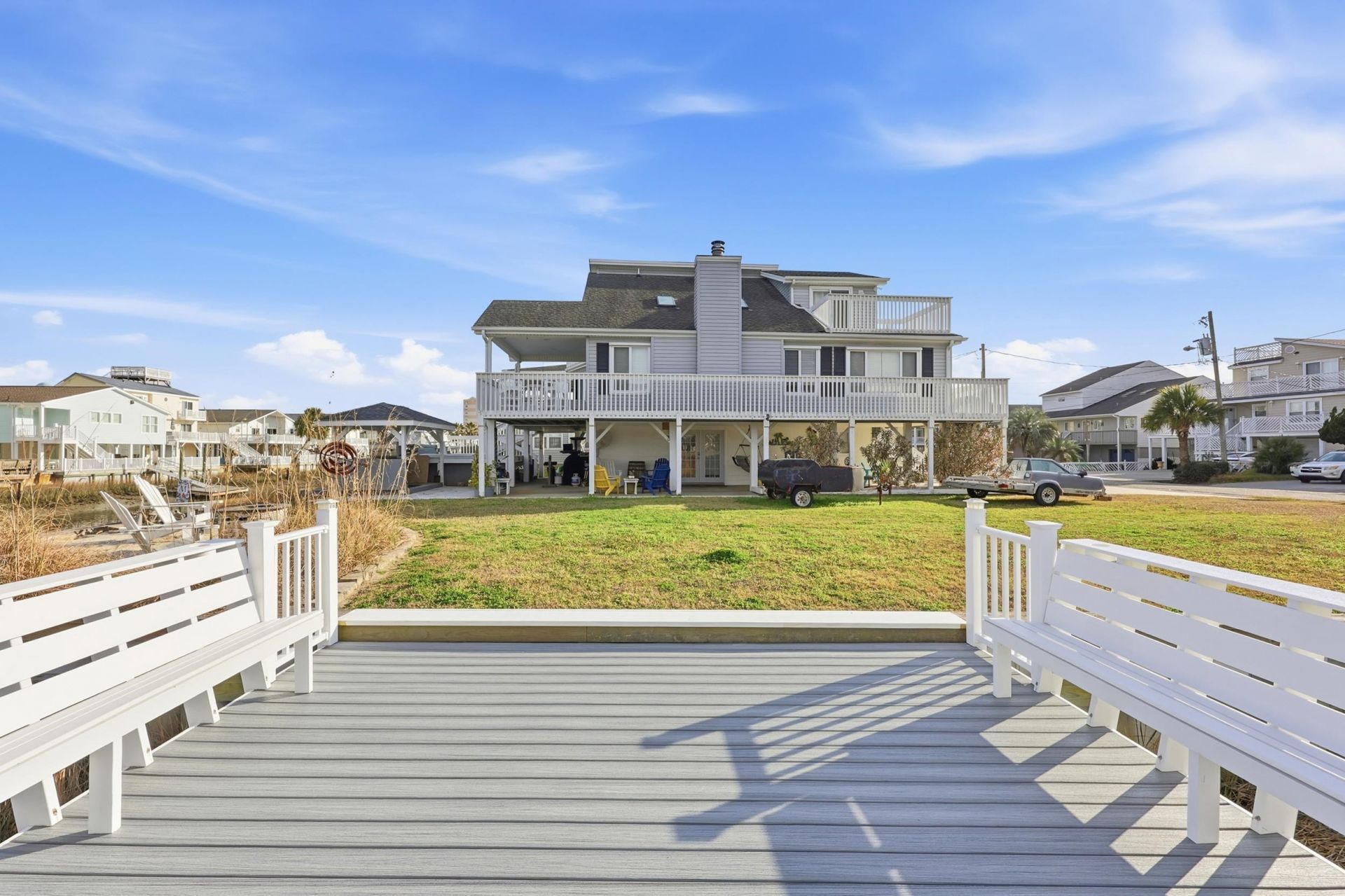 Rare waterfront opportunity in Cherry Grove offering exceptional privacy and sweeping channel views. The home features 4 bedrooms and 3 full baths with vaulted ceilings, a fireplace, and a functional layout for everyday living or entertaining. A lower-level bonus area with bar and full bath adds flexible space for guests or gatherings. Enjoy multiple decks overlooking the water, along with a hot tub, fire pit, and grilling area which are perfect for relaxing or hosting. A rare chance to own a prime waterfront setting with unmatched views.