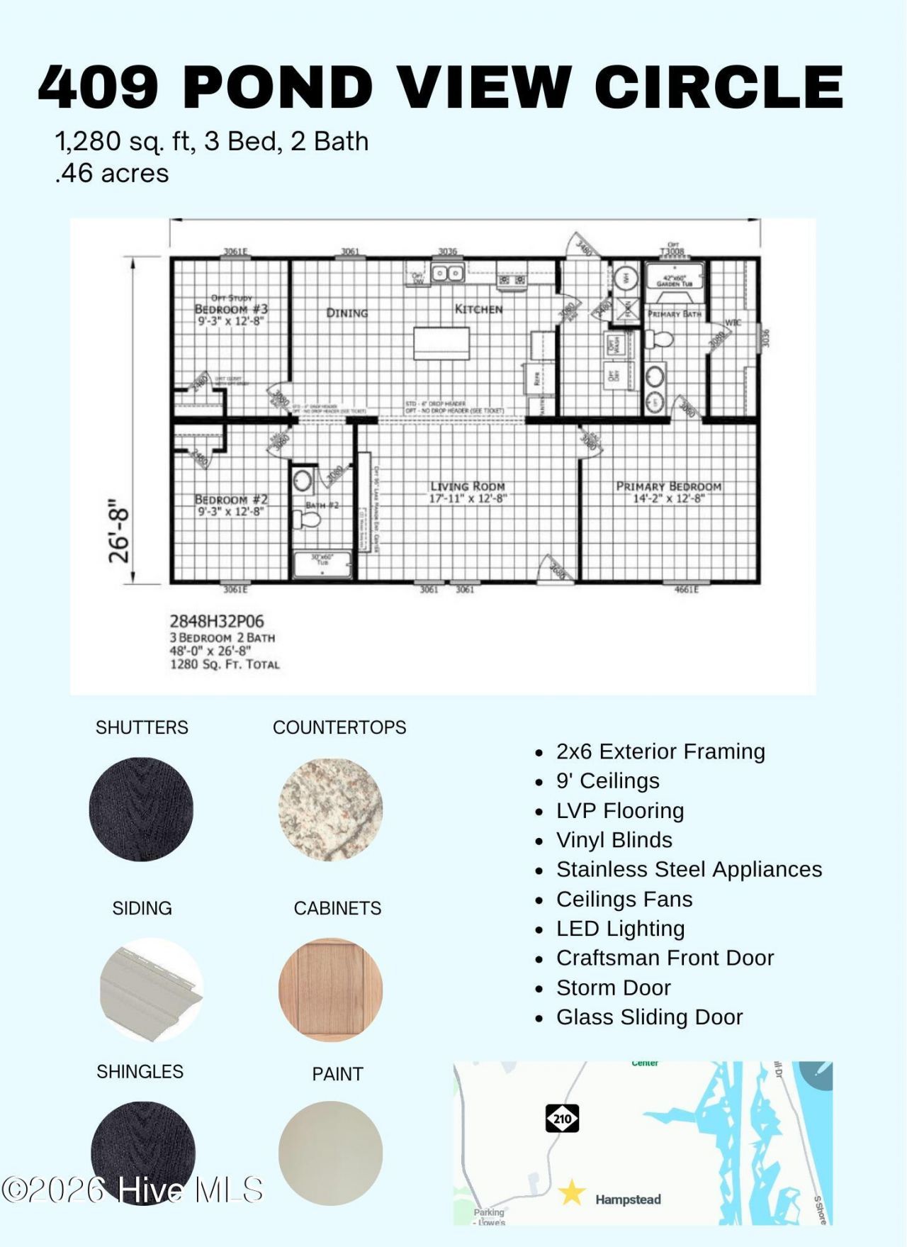 This single family home located at 409 Pond View Circle, Hampstead, NC 28443 is currently listed for sale with an asking price of $294,000. This property was built in 2026 and has 3 bedrooms and 2 full baths with 1280 sq. ft. Pond View Circle is located in the Virginia Creek Forest subdivision. Search Virginia Creek Forest real estate on www.century21thomas.com today.