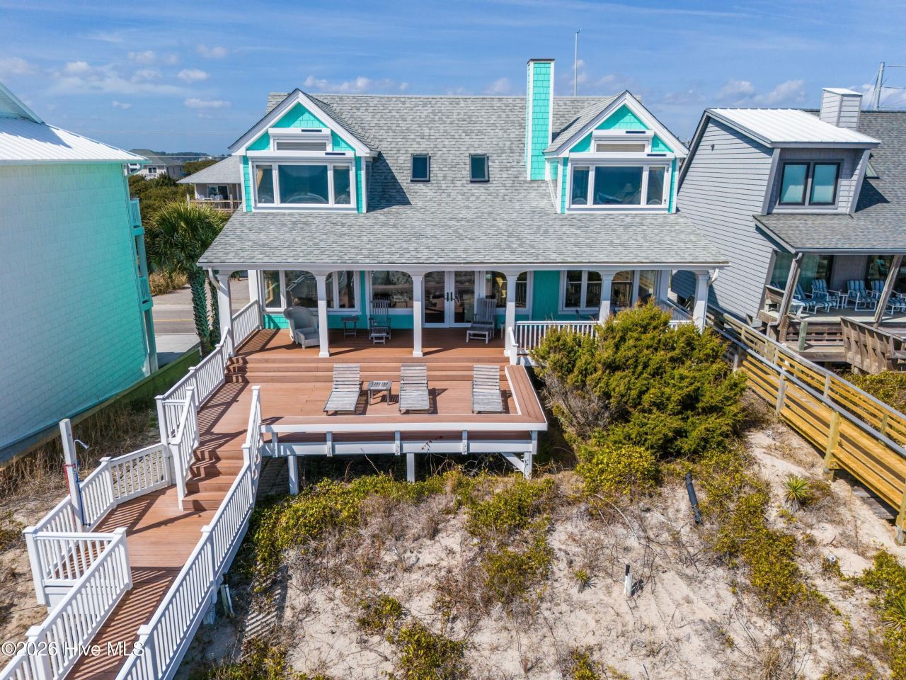 A truly unique oceanfront opportunity in Topsail Beach, this exceptional West Indies-inspired residence offers character, craftsmanship, and sweeping Atlantic views you won't find anywhere else on the island. Thoughtfully furnished by an interior designer to highlight the rich wood interiors and architectural details, the home blends warmth, style, and coastal elegance across three beautifully designed living levels.The entry level welcomes you with an inviting foyer leading to a spacious family room with built-in bunks, a private bedroom with full bath, a laundry room, and interior access to the garage--an ideal layout for guests or multigenerational living.The main living level is anchored by a dramatic living area featuring a massive fireplace and custom built-ins, opening to a dining room and a generous kitchen with custom appliances, abundant cabinetry, a butler's pantry, and an eat-at bar. A guest bedroom with full bath completes this level. Expansive windows frame the high, deep dunes and magnificent ocean views, while a large covered porch and adjoining sun deck provide direct access to the wide, uncrowded beaches of the south end.The top level is dedicated to a space offering privacy and comfort for family and visitors.The quality of the finishes, the curated furnishings, and the overall character of this home set it apart as a rare offering , an oceanfront retreat for the discerning buyer seeking something truly special on Topsail Island