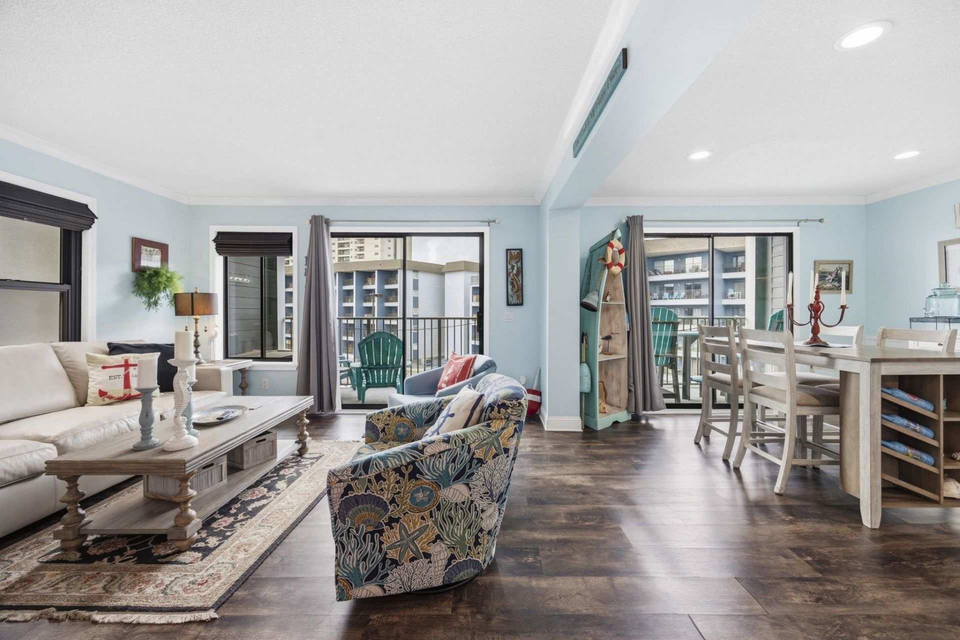 Enjoy beach life in this beautiful ocean view condo located in the popular Myrtle Beach Resort. This is a well maintained 2 bedroom, 2 bath condo that has been recently updated to feature an open concept layout in which. the kitchen, dining room, and living room flow together nicely. The kitchen features modern shaker style cabinets with ample storage, granite countertops, blue glass backsplash and a farmhouse sink. Dining room offers ample seating for you and guests. The living room is appointed with comfortable furnishings including a newer leather sofa, coastal decor, and an electric fireplace for year round enjoyment. This condo is located at a corner so it offers an additional window in the living room., Blinds and curtains adorn the windows and sliding doors for cohesive, tasteful appearance. The Myrtle Beach Resort is a 33 acre oceanfront resort offering numerous amenities, including indoor and outdoor pools, lazy river, hot tubs, gyms, basketball court, tennis courts, horseshoes, cornhole, club house, onsite necessity shop, snack stands, NY Pizza, Stellas Ice Cream, a private owners lounge, and so much more! Enjoy meals, drinks, and entertainment at the onsite bar and grill, the Quarter Deck, voted Best on the Beach! Everything you need for a great beach vacation is right here! The condo may be used as a primary home, second home, or investment property as it allows short term and long term rental. The Myrtle Beach International Airport and area attractions are just a short drive away. Schedule your showing now and let beach life begin!