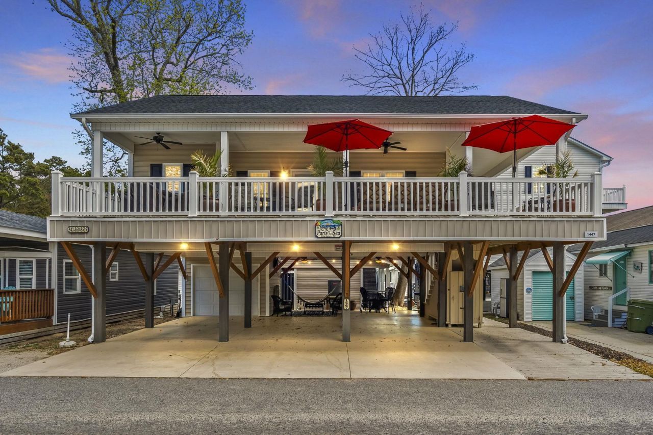 Welcome to 1447, this custom crafted home is a 3-bedroom 2 bath raised beach house. This home stands out with its southern charm and comfortable floorplan. Home has 3 spacious bays underneath for plenty of parking plus a bonus pay for golf cart parking. As you walk up the COVERED steps, youre have a large covered wrap around porch to sit back and relax. Home features hardwood flooring throughout, granite counter tops, vaulted ceilings in the living space, durable ceramic tile in the bathrooms, upgraded vinyl siding, and upgraded windows. The kitchen offers custom cabinets, granite counter tops, and an upgraded tile backsplash. With a split floor plan, the primary bedroom and bathroom is separate from the other two bedrooms. The primary bedroom has an exterior door that leads out to the back half of the covered porch. Two more spacious bedrooms, full bath #2 and washer/dryer. Home is conveniently located on the Southside of Ocean Lakes, close to all the amenities including indoor/outdoor pools, lazy river, waterpark, mini-golf, arcade, basketball courts, volleyball courts, and much more! Come check out this property today! All measurements are approximate and not guaranteed. Buyer responsible for verification.