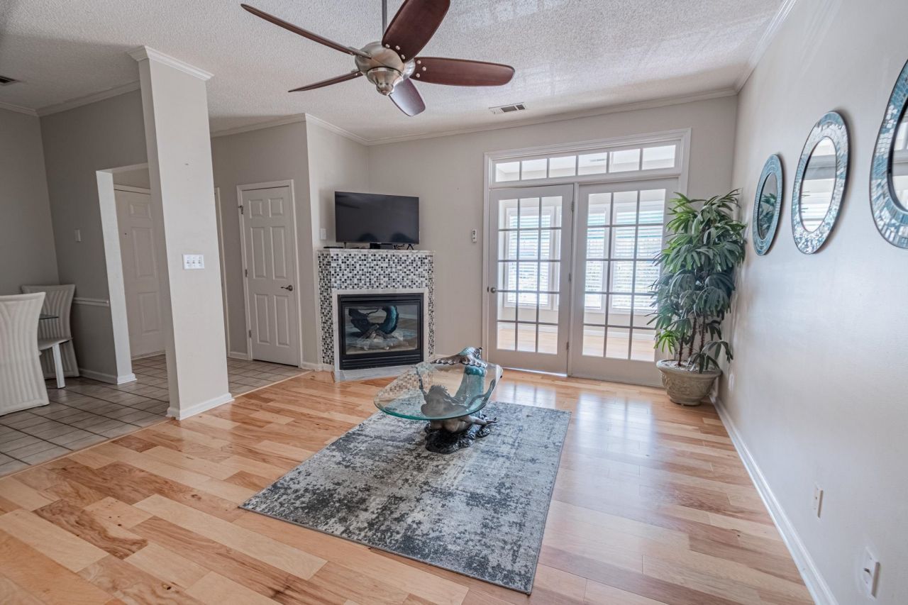 Second floor end-unit, two-bedroom, one bath condo located in the gated community of Savannah Shores. This unit features a welcoming foyer entry, wood and tile flooring. Kitchen is equipped with white cabinets, stainless steel appliances, and a cozy breakfast nook. The living room offers vaulted ceilings with a fan and a fireplace for added comfort. Enjoy the bright Carolina room with picture windows that let in abundant natural light and include a closet for additional storage. The sizable primary bedroom also boasts vaulted ceilings, two picture windows, and a closet. The bathroom has a vanity and a tub/shower combo and is accessible from both the bedroom and the living room. Savannah Shores offers resort-style amenities including a clubhouse, pool, tennis and pickleball courts, putting green, shuffleboard, car wash area, outdoor grilling, playground, fitness center, and golf cart parking. Conveniently located just a short drive to the beach. Square footage is approximate; buyers should verify.