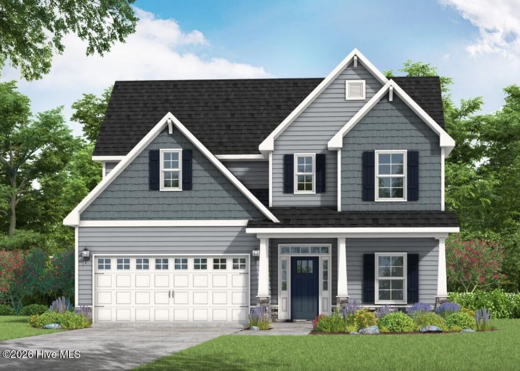 Graham plan. Just off the foyer, a formal dining room features an accent wall painted in SW ''Gale Force.'' The great room flows into the kitchen and breakfast area and is highlighted by a gas fireplace with black granite surround and a mantel. The kitchen offers an eat-in island,''New Willow White'' quartz countertops, white shaker cabinets, white herringbonebacksplash, a pantry, and stainless-steel appliances, including a microwave, dishwasher, and gas range. The breakfast area provides easy access to the rear grill patio. Upstairs, a loft provides additional living space, while the nearby laundry room includes a linen closet. The primary suite features a tray ceiling with crown molding, and an en-suite bathroom with a dual quartz sink vanity, garden tub, walk-in shower, private water closet,and large walk-in closet with a window. Two additional bedrooms with walk-in closets share a full hall bathroom with a vanity, tub/shower combo, and linen storage. Exterior features low-maintenance vinyl siding with shake accents, stone skirt, dimensional roofshingles, a front porch with SW ''Sea Serpent'' door, and smart keypad entry. Also included: 3-car garage, Energy Plus certification, and a 1-2-10 builder in-house warranty.